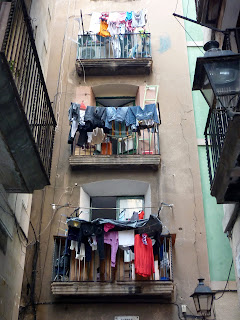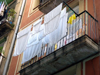 Hay sitios para tender la colada de lo mas diverso, desde los tradicionales en sus cuerdas a un ventana, pero dentro, a unas perchas, incluso en la reja de la ventana aunque tengas todas las cuerdas vacías, curioso, un calcetín por aquí una braguita por allá.