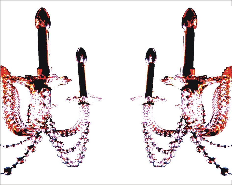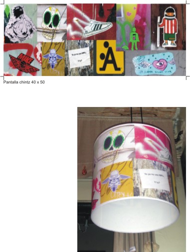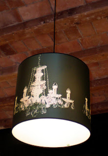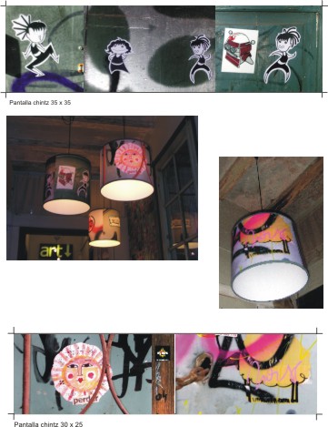 Este es el diseño que posiblemente más me gusta, el sticker es una fotografía-fotocopia de sillones antiguos. Se montaron en diferentes formatos, de sobremesa con un pie de hierro, de techo circular u ovalada (que es la que tengo en el comedor de mi casa). Me parece moderna, elegante y diferente.