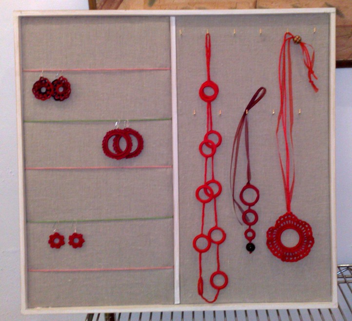 un colgador de collares y pendientes puede ser un cuadro decorativo para nuestro dormitorio, solo hay que usar cintas y telas antiguas