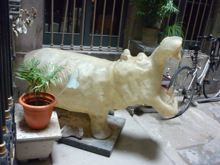 Empecemos por saber que hace un hipopotamo de fibra de vidrio en el patio de una pensión de barrio gótico.