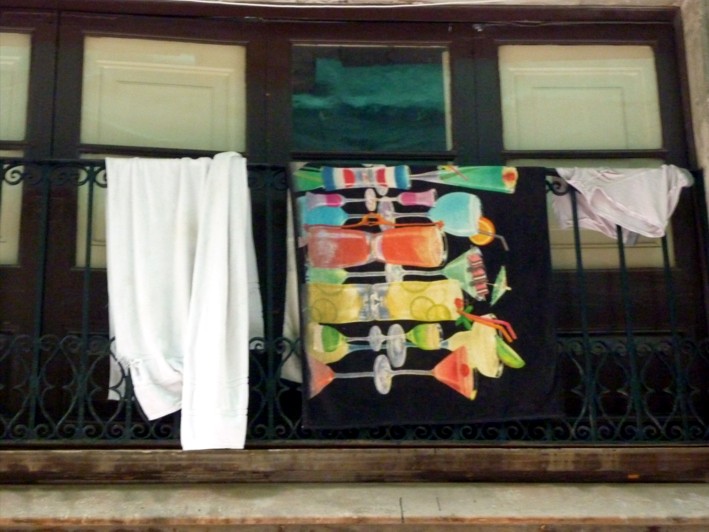 Unos cuelgan en el balcon el souvenir de su propia ciudad ( esta bien que alguien de aqui visite los monumentos que tenemos), otros cuelgan sus preferencias nocturnas y sus intimidades diarias.