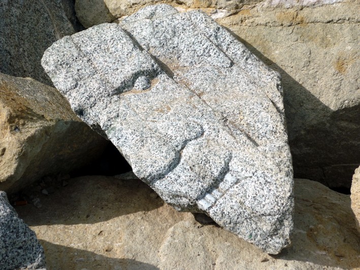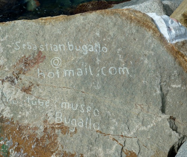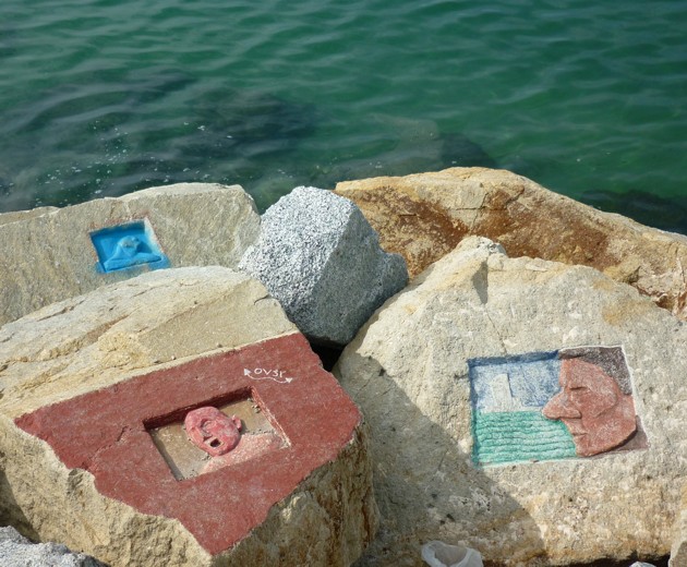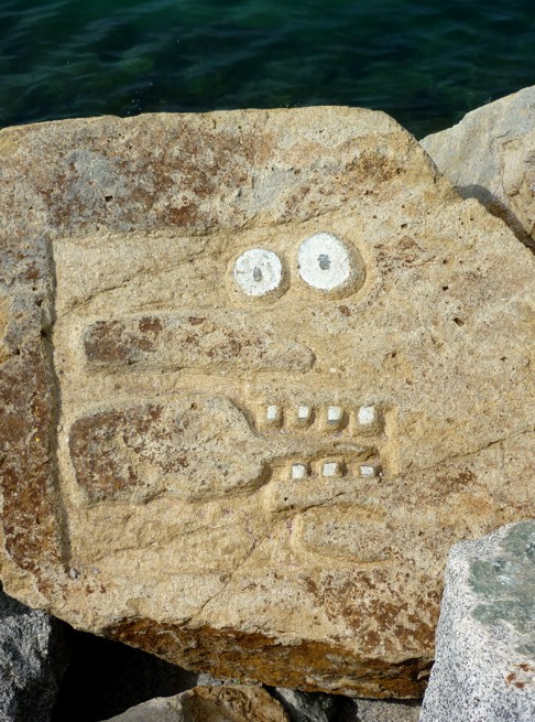 En el espigón de la derecha hay una barra que "teoricamente" impide el paso pero que todo el mundo la cruza por debajo y por el que nos adentramos en el propio espigón. Iniciamos nuestro paseo-exposición por el espigón y observamos que en las rocas de la derecha hay talladas en las rocas caras y siluetas, algunas pintadas otras no.