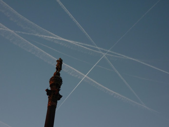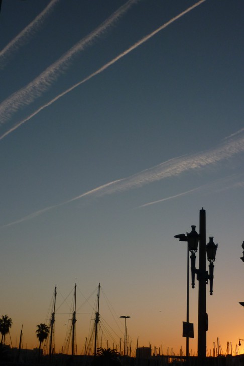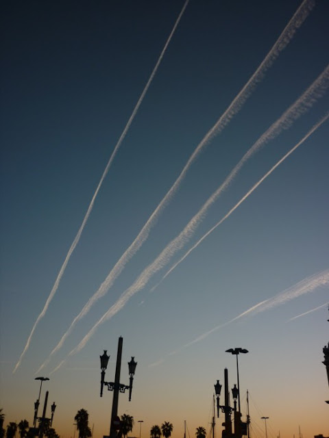 Conforme iba bajando hacia el puerto (que es donde trabajo) las estelas se mantenían en el cielo sin disminuir su intensidad pero al llegar junto al Pº Colon era increíble el cielo estaba lleno de ellas y se cruzaban unas con otras dejando sus huellas en un cielo limpio y con una luz difícil de describir.